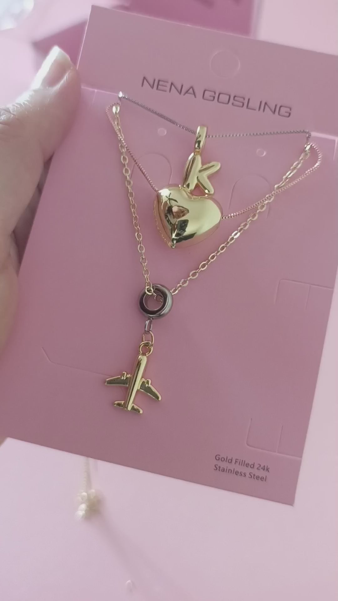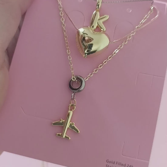 Set de 3 collares en capas con dije de avión, inicial y corazón.